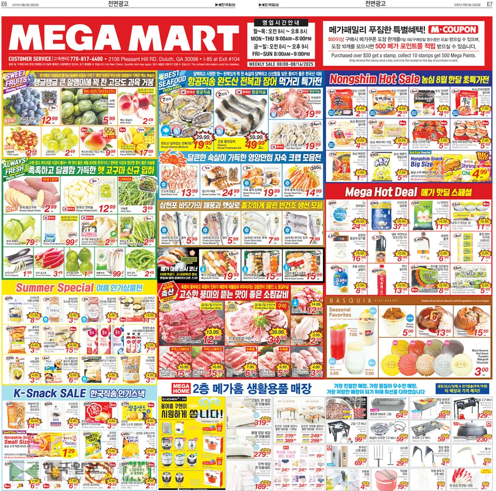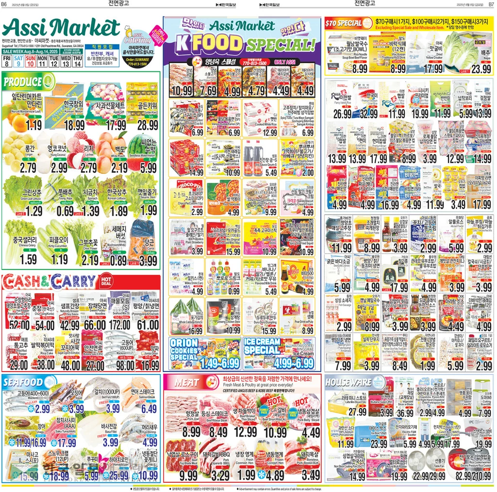그로서리 코너에서는 사옹원 아삭김치전 , 김치전, 해물파전,야채전300 G 3.49, 백설 (씨제이)부침가루, 튀김가루1KG 2.99, CJ 비비고 삼계탕800G 8.99, 서울마님 매콤 콘치즈,통모짜 떡구이 떡범벅,불닭 콘치즈 ,불닭 통모짜 떡구이 떡범벅 320G 3.49, 우리 헤시온 마카로니스낵342 G 4.99, GEO 크런키 초코스틱,땅콩 초코스틱, 아몬드 초코스틱54G 1.29, 오리온 촉촉한 초코칩 160G2.49, 오리온 후레쉬베리 복숭아, 오리지날 12P-336G12PK 4.49,농심 블랙 신 멀티 4PK/130G 5.99, 농심 둥지 비빔 냉면 3PK/159G 4.99, 삼양 불닭 야키소바 멀티5PK/125G 5.99, 삼양 맵 멀티 블랙페퍼 & 비프, 마늘 & 조개4PK/110G 4.99, 서울마님 콩고물 쑥인절미,콩고물인절미, 호박카스테라 인절미, 흑임자 인절미, 카스테라 인절미 100G 1.99, 서울마님 한국 쌀떡 (콩코물), (검은깨) 200G 3.99, 사과파이 스파클링 소주 (사과,멜론,파인애플,딸기,수박,청포도,복숭아,리치) 375ML 4.99, 킹카 레몬티 19.6OZ 1.79, 칸타타 카라멜 마끼야또, 프리미엄 블렌드 275ML 1.99, 심 무파마 라면 4PK 5.99, 경기 안성쌀10 KG 28.99, 20 KG 54.99에 판매된다.