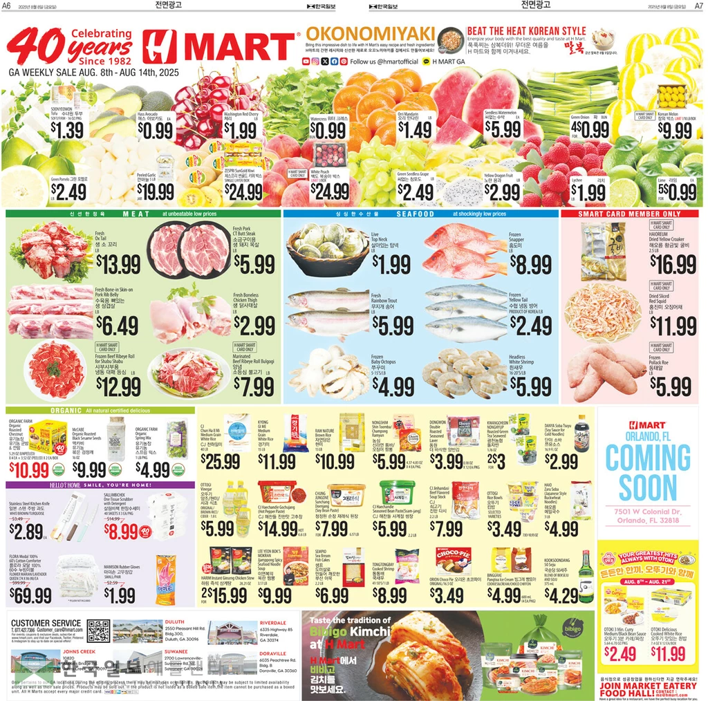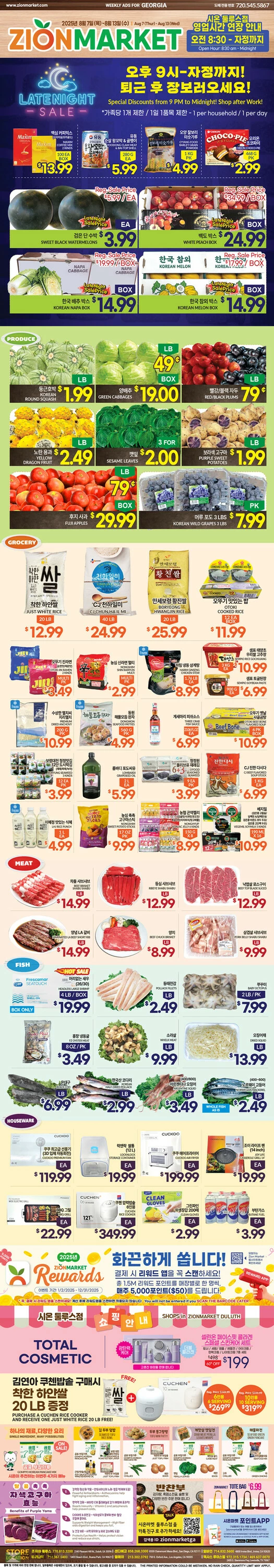 과일 코너에서는 (금/토/일 한정) 한국 참외 박스17.99,(금/토/일 한정) 백도 복숭아 파운드 2.49,교호포도(한국 거봉)팩(3LB) 14.99, 씨없는 수박 ea 4.99,생대추 파운드 2.49,그린자두 파운드 2.49,멕시칸 (레드) 망고박스 9.99에 선보인다.