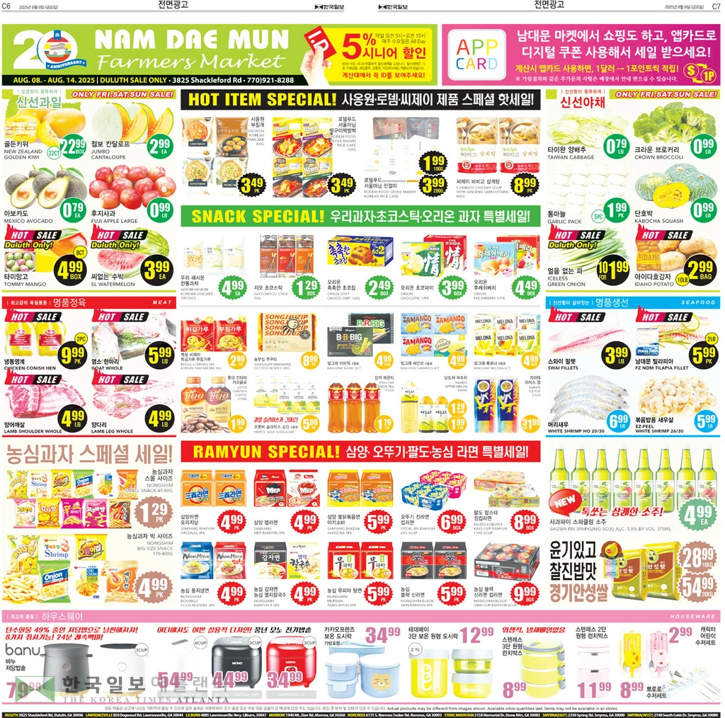 이번주 메인품목으로는 삼양 불닭 볶음면 (5P) 6.99, 까르보 불닭 볶음면 (5P) 6.99, 농심 신 라면 컵 (6P)6.99,너구리 컵 (6P) 6.99, CJ 햇반12X210G 12.99, 아씨 서천 재래김 (도시락,선물박스) 10.99, 샘표 진간장 금-S1.7L 5.49, 비비고 포기 김치 2KG 16.99, 농심 신라면(4PX4) 14.99,오리온 꼬북칩 (콘스프맛_7P BOX) 10.99, 오뚜기 뿌셔뿌셔 (떡볶이) 3.17 OZ 2FOR$2.00, 크라운산도 딸기 크림 323G 4.99, 산도 크림323G 4.99, 오리온초코파이16.5OZ 2.99, 고소미 (12P) 2.99, 윌 요구르트 플레인4X150ML 3.99 풀무원아이스 홍시 4PC 4.99 등이 선보인다.