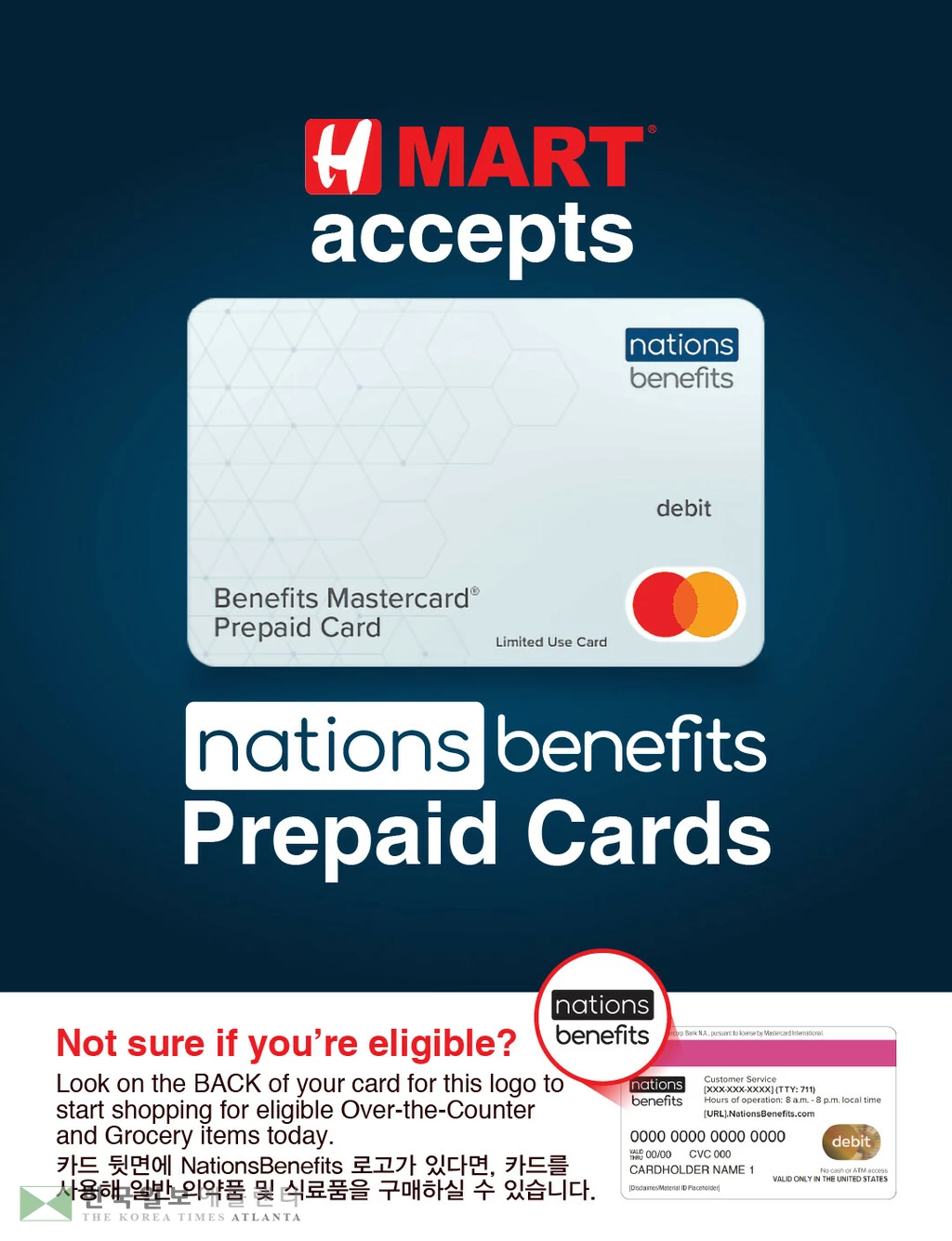 이번 파트너십을 통해, 해당 건강보험 플랜에 가입한 자격 있는 H 마트 고객들은 이제 모든 매장에서 NationsBenefits® 플렉스 카드를 사용하여 신선한 농산물, 특산 식재료, 일반 의약품 및 웰빙 상품 등을 NationsBenefits 플렉스 카드로 구매할 수 있게 된다.