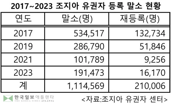이 같은 유권자 등록 말소 규모는 2017년 이어 사상 두번째 규모로 현재 조지아 전체 유권자 840만명의 6%에 해당된다.