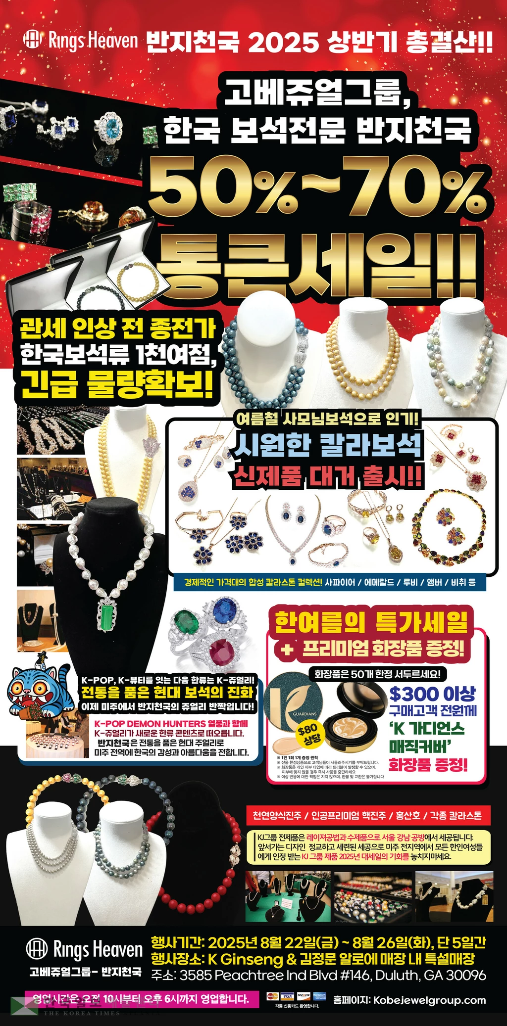 고베쥬얼그룹이 오는 8월 22일금)부터 26일화)까지 5일간 애틀랜타 둘루스 지역 K Ginseng & 김정문 알로에 매장 내 특설매장에서 한국 보석 전문 브랜드 ‘반지천국’ 특별전을 연다.