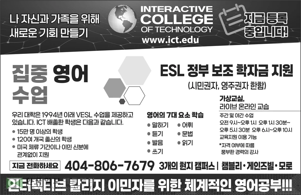 ICT에서 전문 교사와 공인된 커리큘럼은 미국 어디에서도 볼 수 없는 가장 포괄적이고 완벽한 프로그램 중 하나를 제공한다.이 프로그램은 120개국 이상의 학생들에게 말하기, 듣기, 발음, 읽기, 쓰기, 어휘 및 문법의 핵심 영역을 가르친다. 자세한 내용은 ict.edu를 방문해 Interactive College of Technology의 직업 영어 프로그램에 대해 자세히 알아보면 된다. 박요셉 기자
