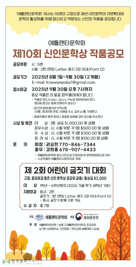 애틀랜타문학회(회장 권요한)는 이민문학의 저변확대와 문학 활성화를 위해 제10회 신인문학상 작품을 공모한다.