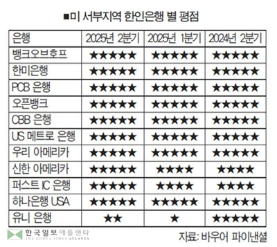 매 분기마다 전국 금융기관에 대한 ‘별 평점’(Star Rating)을 발표하는 금융전문 신용평가사 ‘바우어 파이낸셜’은 금융기관에 대한 별 평점을 2025년 2분기 영업 실적과 자산건전성, 수익성, 신용도 등 다양한 경영평가 지표를 토대로 27일 발표했다. 한인은행을 포함, 연방예금보험공사(FDIC) 예금보험에 가입된 전국 4,500개 시중은행들이 평가 대상이다. (도표 참조)