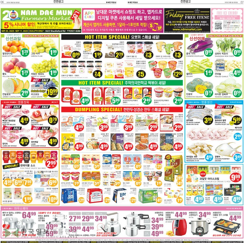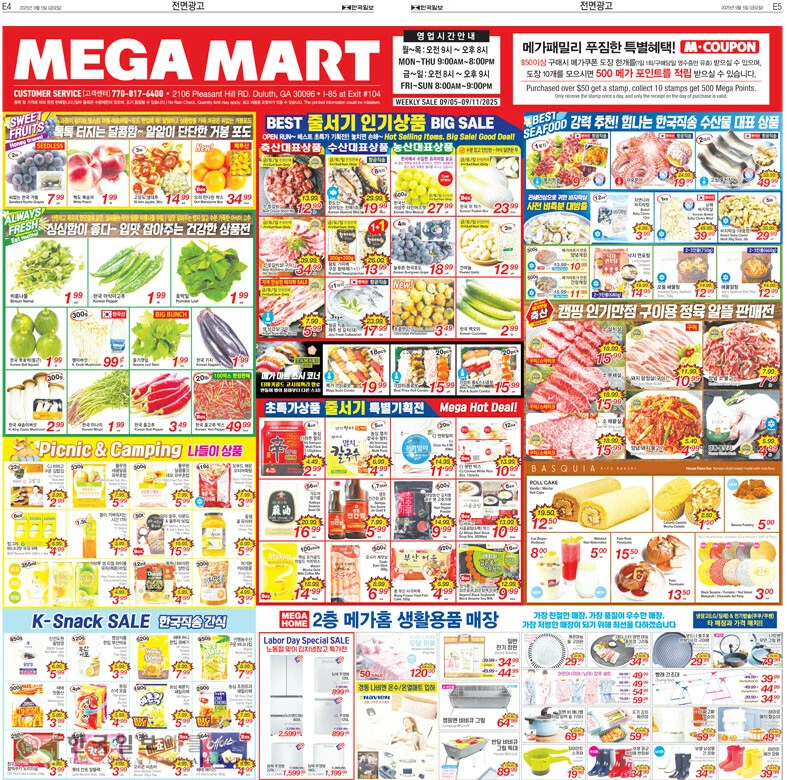 프로듀스 코너에서는 라고포도6LB/BOX 19.99, 그린자두LB 1.99, 씨없는 청포도LB 1.99, 황도LB 1.29, 멀컷 만다린LB 1.29, 점보 켄탈롭 EA 2.99, 중국가지EA 0.99, 상하이 박초이LB 0.99, 깐마늘 1LB/PK 4.99,단호박 LB 0.79, 타이완 양배추LB 0.59, 샐러리 EA 1.49에 공급된다.