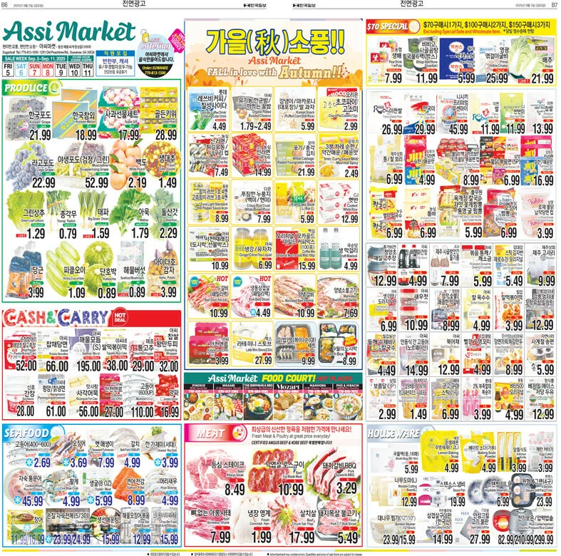 생선 코너에서는 생 은대구 LB 6.99, 미더덕LB 4.49,왕 반건조 황태코다리 (24 OZ) PK 7.99, 연질꽃게 (330 G)PK 10.99,홍창 냉동굴 (8 OZ)PK 3.49, 시메사바 (125 G)PK 3.99, 백진미 오징어채LB 13.99, 마산식 아구찜 (690 G) PK 12.99, 아르젠티나 오징어 (400/600) LB 3.49, 노르웨이 고등어 (400/600) LB 2.49에 판매된다.