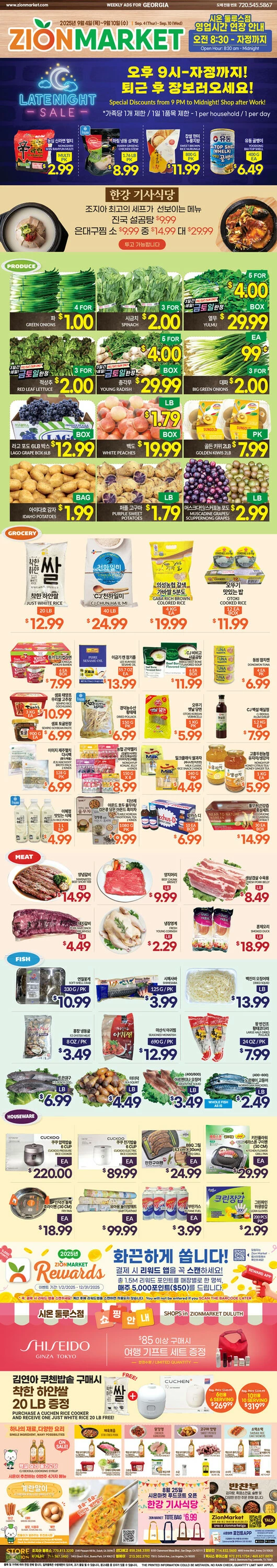 그로서리 코너에서는 자연담은 자연미 40LB EA 24.99, 화성 수향미 골드퀸 3호 22LB(10KG) EA 32.99, 자연담은 현미 15LB EA 10.99, 팔도 진국설렁탕(5PK 멀티) EA 4.99, 푸드셀 납작당면 1LB EA 3.49, CJ 백설 찹쌀호떡믹스 14.1OZ(400G) EA 4.49, 청정원 순창 재래식된장 6.17LB(2.8KG) EA 7.99, 샘표 양조간장 자연숙성 701 (1.7L)EA 7.99, 큐피 드레싱 참깨 8OZ EA 3.99, 큐원 알룰로스 1/10칼로리 24.70OZ(700G) EA 7.99, 오뚜기 옛날 미역 250G EA 8.99, 청정원 런천미트 12OZ EA 2.99, 농심 빵부장 소금빵 스낵 1.94 OZ (55G)EA 1.99에 판매된다.