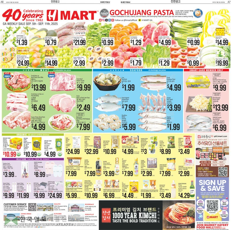 인기상품 BIG SALE전에서는 (금/토/일 한정) 소 갈비찜 파운드 12.99, (금/토/일 한정) 소 꽃갈비살 (구이 ) 파운드34.99, (금/토/일 한정) 생 삼겹살 파운드 5.99, (금/토/일 한정) 완도산 살아있는 전복 (대) 8 ea 19.99, (금/토/일 한정), 황태가마에 구운 황태채 (2pk) 9.99, (금/토/일 한정) 한국산 서상주 샤인 머스캣 팩 27.99, 항공 직송 제주생 갈치 (대) ea 17.99, 늘푸른 한국 포도 팩 19.99,초콜렛 단감 파운드 3.49, (금/토/일 한정)한국 무박스 21.99, (금/토/일 한정)깐마늘 팩 12.99,한국 백오이 파운드 2.99에 제공된다.