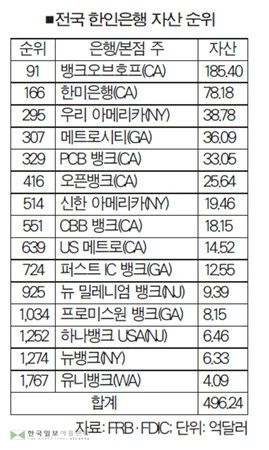 PCB 은행(행장 헨리 김)은 자산규모 33억500만달러로 329위, 오픈뱅크(행장 오상교)는 자산규모 25억6,400만달러로 416위, CBB 은행(행장 리처드 고)은 자산규모 18억1,500만달러로 551위, US 메트로 은행(행장 김동일)은 자산규모 14억5,200만달러로 639위에 각각 랭크됐다.