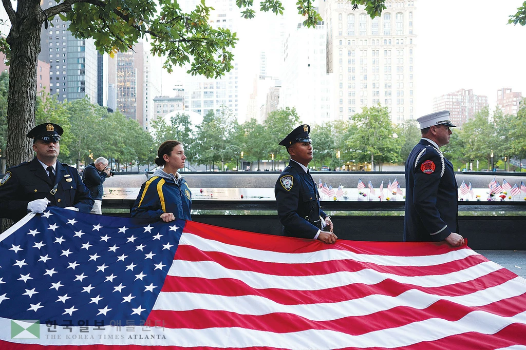 미국 역사상 최악의 참사로 기록된 9.11 테러 24주기 추모식이 11일 항공기 충돌로 무너진 세계무역센터(WTC)가 세워졌던 자리인 맨하탄 ‘그라운드 제로’에서 엄숙한 분위기 속에 열렸다. 이날 추모식에서 희생자의 유족과 동료들이 연단에 올라 3,000명에 가까운 희생자의 이름을 일일이 호명하고 종을 치는 추모 절차도 변함없이 진행됐다. 그라운드제로 추모식장에 대형 성조기가 등장하고 있다. <로이터>