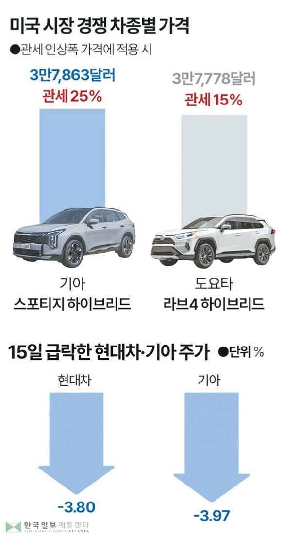 이날 기준 각 사에 따르면 기아 스포티지 하이브리드는 미국 권장소비자가격(MSRP)이 3만290달러(약 4,200만 원)로 설정돼 있다. 경쟁 차종인 일본 도요타의 라브4(3만2,850달러)보다 360만 원가량 저렴하다. 스포티지는 8월 미국 시장에서 현대차·기아를 통틀어 가장 많이 판매된 차종이다. 한국과 일본이 각각 관세 인상 폭만큼 미국 내 판매 가격을 올린다고 가정하면, 스포티지(3만7,863달러)는 라브4(3만7,778달러)와 비교해 가격이 조금 높아진다. 우리 차에만 25% 고관세가 유지될 경우 가격 경쟁력에서 밀릴 수밖에 없다.