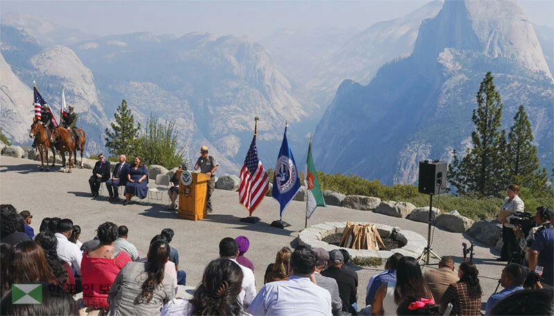 17일 요세미티 국립공원에 특별한 시민권 선서식이 열렸다. 요세미티의 명물 중 하나인 글레이시어 포인트 전망대에서 시민권 선서식이 열린 것이다. 이날 연방 이민서비스국(USCIS)은 총 70명의 신규 시민권 취득 이민자들과 가족들이 모인 가운데 선서식을 가졌다. 요세미티 전망을 배경으로 말을 탄 기수대가 등장한 가운데 시민권 선서식이 진행되고 있다. [로이터]