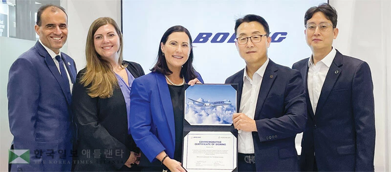 대한항공은 보잉사와 항공기 예지정비 분야의 협력을 강화하는 전략적 파트너십을 맺었다고 17일 밝혔다. 예지정비는 항공기 부품이나 시스템에 결함이 생길 시점을 예측하고 실제 고장이 발생하기 전 선제적으로 조치를 취하는 정비다. 이번 협력은 항공기의 결함을 줄이고 항공기 신뢰성을 높이기 위해 추진됐다. 정비 효율성을 높이고 안전 운항에도 기여한다. 이날 싱가포르에서 정찬우 대한항공 정비본부장과 크리스탈 렘퍼트 보잉 시니어 디렉터가 각서를 보여주고 있다. [대한항공 제공]