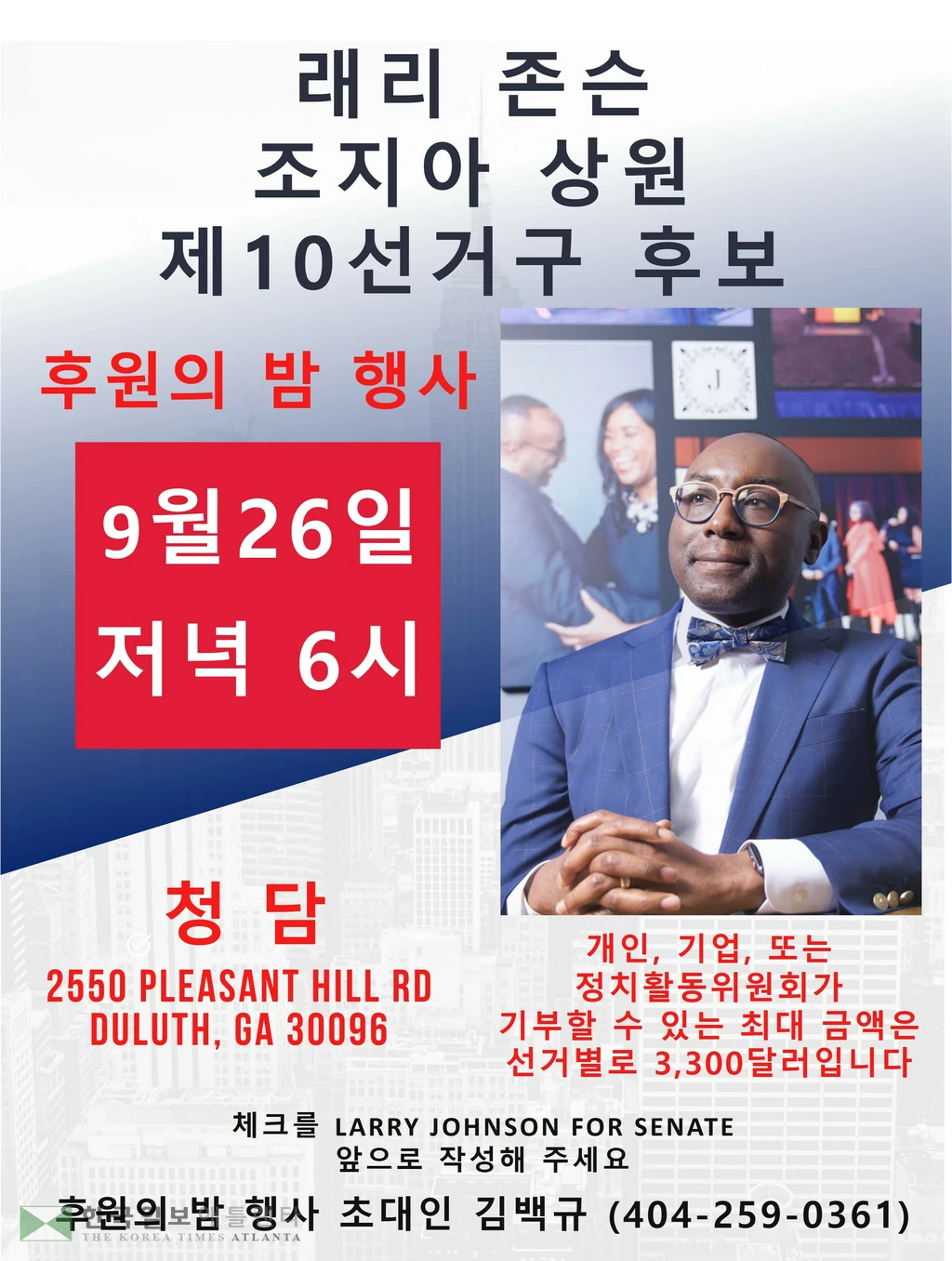 후원의 밤은 9월 26일(금) 오후 6시 둘루스 청담에서 열린다. 선거운동 기부금은 최대 3,300달러까지 기부할 수 있다. 체크는 LARRY JOHNSON FOR SENATE로 작성하면 된다. ▶문의=김백규 404-259-0361. 박요셉 기자