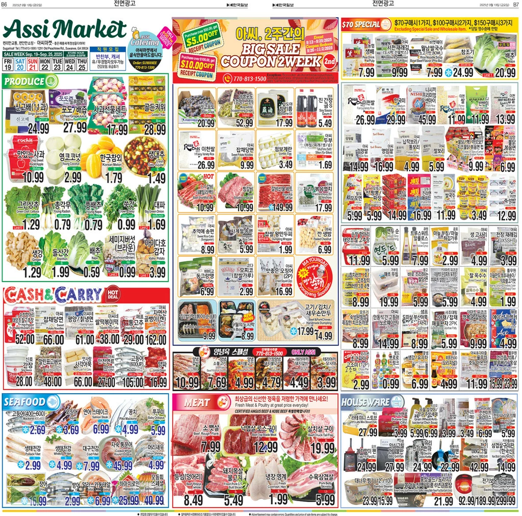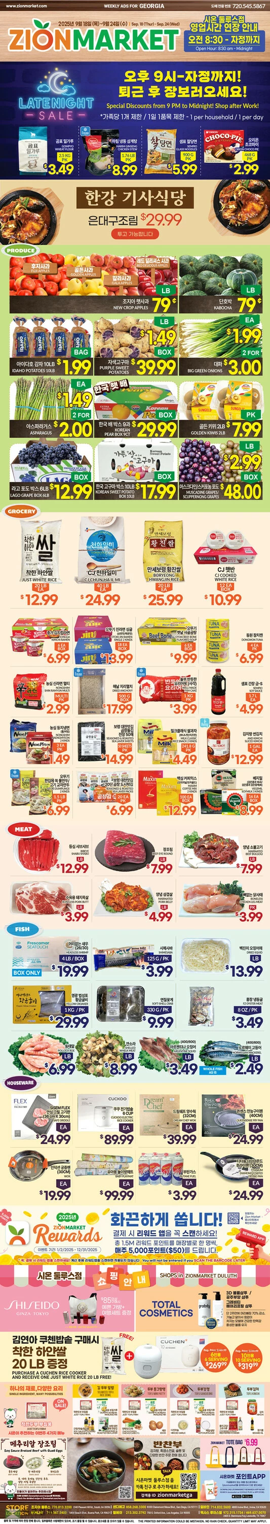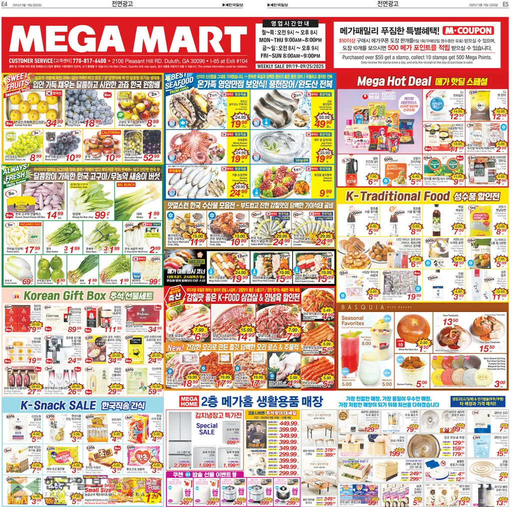과일 코너에서는 한국산 원황배 박스 ( 9 과)34.99,라고포도 박스 18.99,고당도 유기농 생대추 팩 8.99,샤인 청포도 팩 8.99,한국 거봉 (피오니 ) 팩 10.99,생밤 파운드 10.99,야생포도(퍼플/그린) 각 basket 52.99에 판매된다.