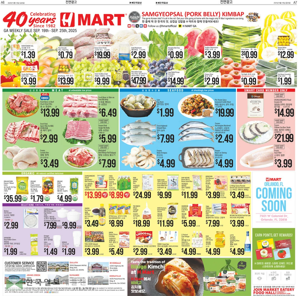 그로서리 코너에서는 자연담은 자연미 40LB EA 24.99, 하루하루마이 15LB EA 9.99, 자연담은 현미반 찹쌀반 15LB EA 11.99, 농심 신라면 툼바 멀티 4.83 OZ (137G)/4EA 3.99, 청정원 찰고추장+쌈장 (Hmart 40주년 기획) 500g EA 13.99, 샘표 국간장 29.08FLOZ (860ML) EA 3.49, CJ 백설 햇바삭김 재래김 (5G/8) EA 3.49, 오뚜기 카레 순한맛 1KG(2.2LB) EA 8.99, 오리온 초코파이 1.37OZ(39G)12pk EA 2.99에 선보인다.