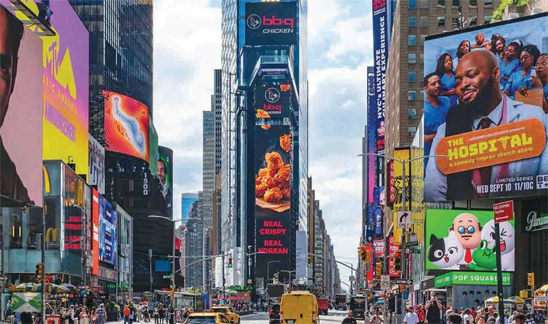 한국 치킨 프랜차이즈 제너시스BBQ 그룹은 뉴욕 타임스스퀘어 한 가운데 있는 ‘원 타임스스퀘어’ 전광판에 BBQ 브랜드 광고를 내보낸다고 18일 밝혔다. 광고 영상은 BBQ의 핵심 가치를 담은 세 편이며 지난 1일부터 11월 23일까지 약 3개월간 매시간 3분씩 하루 72분, 총 6,048분(101시간)에 걸쳐 나간다. BBQ는 2007년 미국 진출 이후 캘리포니아, 뉴욕, 뉴저지, 텍사스, 하와이, 오리건 등 32개 주에서 매장을 운영하는 등 영업망을 확장하고 있다. [연합]