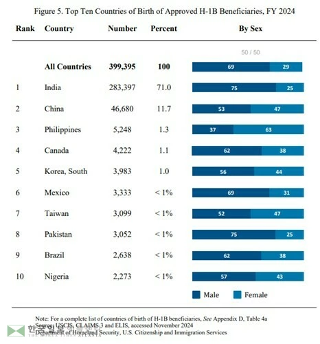 미국 국토안보부(DHS)와 미국 이민국(USCIS)이 미국 의회에 제출한 보고서에 따르면 2024 회계연도(2023년 10월 1일부터 2024년 9월 30일까지)에 H-1B 비자 청원이 승인된 전문직 근로자 39만9천395명의 출생 국가를 따져볼 때 인도가 28만3천397명으로 71.0%를 차지해, 2위인 중국(4만6천680명, 11.7%)보다 훨씬 많았다.