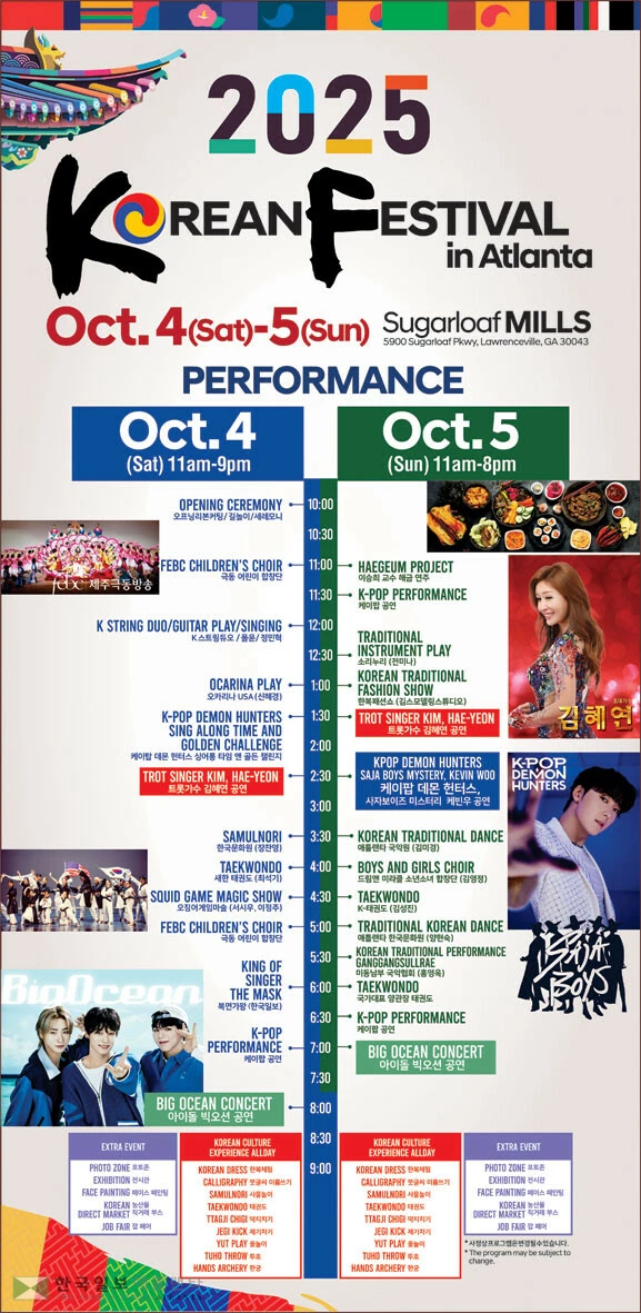 애틀랜타 코리안페스티벌재단이 주최하는 2025 코리안페스티벌이 오는 10월 4(토)일, 5(일)일 이틀간 로렌스빌 슈가로프 밀스 주차장에서 열린다. 다양한 공연과 먹거리, 한국의 특산품 등으로 즐길 수 있다.