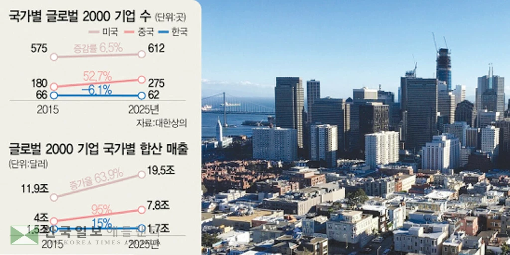 국가별 2000대 기업의 합산 매출액도 중국의 경우 2015년 4조 달러에서 2025년 7조 8000억 달러로 두 배 가까이 늘었다. 같은 기간 미국은 11조 9000억 달러에서 19조 5000억 달러로 63% 증가했고, 한국은 약 1조 5000억 달러에서 1조 7000억 달러로 15% 늘어나는 데 그쳤다. 기업의 성장 속도마저 중국이 한국보다 6.3배나 빠른 셈이다.