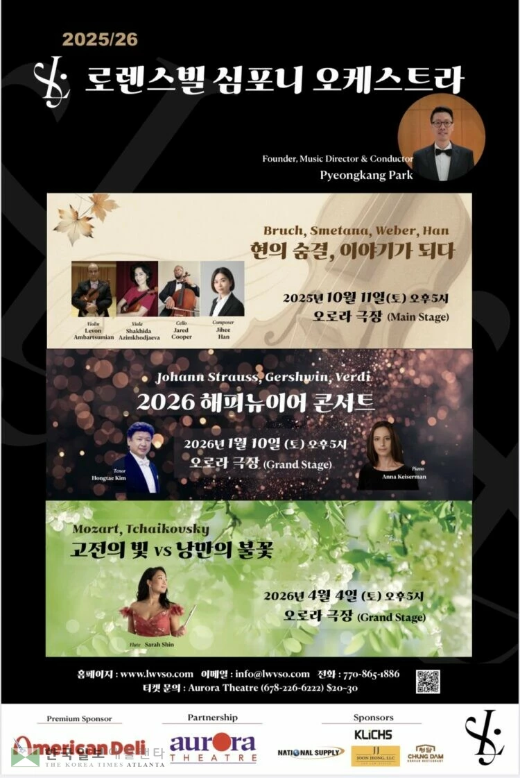 한편, 로렌스빌 심포니 오케스트라는 이번 개막 공연에 이어 ▲2026년 1월 10일(토) ‘해피 뉴 이어 콘서트’ ▲4월 4일(토) ‘고전의 빛 vs 낭만의 불꽃’ 무대를 이어가며 시즌을 이어갈 계획이다.