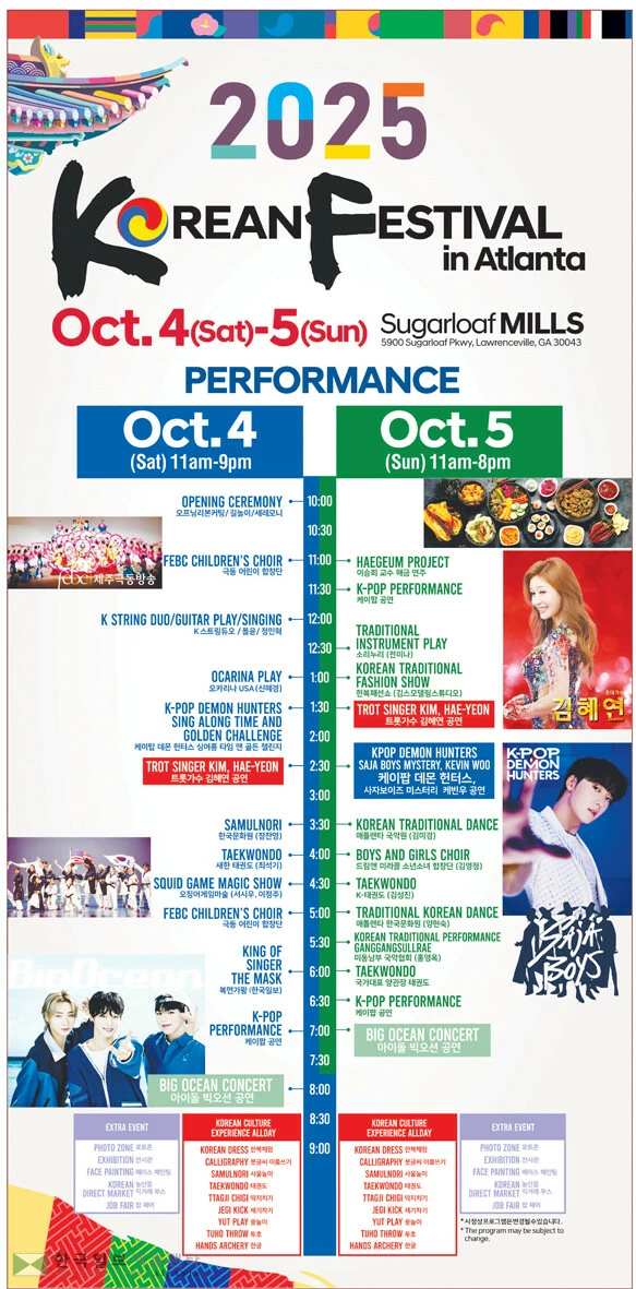 애틀랜타 코리안페스티벌재단이 주최하는 2025 코리안페스티벌이 오는 10월 4(토)일, 5(일)일 이틀간 로렌스빌 슈가로프 밀스 주차장에서 열린다. 다양한 공연과 먹거리, 한국의 특산품 등으로 즐길 수 있다.