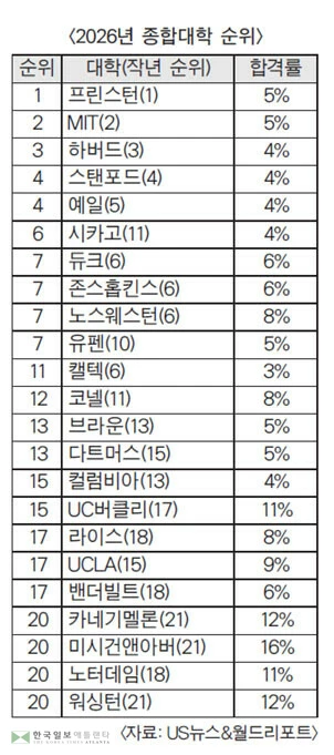 올해 발표된 순위에서 ‘종합대학’(National Universities) 부문 1위는 뉴저지주의 프린스턴 대학교가 차지했다. 이어 ‘매사추세츠공과대학’(MIT), 하버드대학교, 스탠퍼드대학교, 예일대학교가 뒤를 이었다. 상위권 대학 간 순위 변화는 작년과 비교해 거의 없었다. 이는 평가 방식에 큰 변화가 없었던 데 따른 것으로 풀이된다.