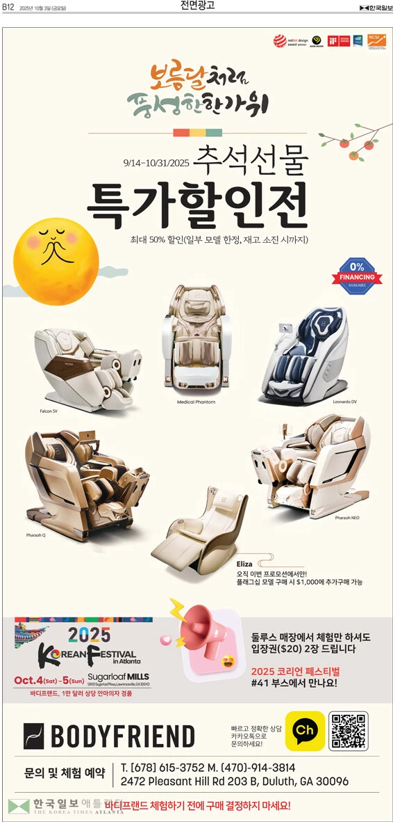 바디프랜드는 10월 31일까지 일부 모델에 한정해 최대 50% 할인전을 실시하고 있다. 문의 및 체험 예약=678-615-3572, 470-914-3814.