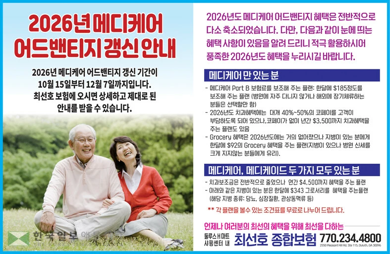 최선호 초이스 보험은 12월 7일까지 마감인 2026 메디케어 어드밴티지에 대해 안내한다. 각 플랜을 볼수 있는 조건표를 무료로 배포한다. 전화=770-234-4800.