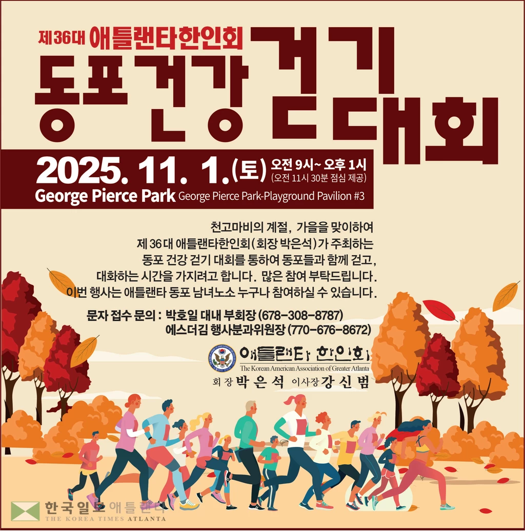애틀랜타 한인회(회장 박은석)가 오는 11월 1일(토) 조지 피어스 파크에서 ‘건강 걷기 대회’를 개최한다. 행사는 오전 9시부터 오후 1시까지 진행되며, 한인 동포들이 함께 걷고 소통하는 시간을 가진다.