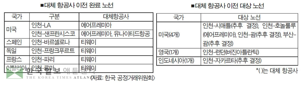대체 항공사 이전절차 개시 노선은 인천-시애틀, 인천-호놀룰루, 인천-괌, 부산-괌 미국 4개 노선, 인천-런던 영국 1개 노선이다. 인천-자카르타 인도네시아 1개 노선, 김포→제주, 광주→제주, 제주→김포, 제주→광주 등 한국 4개 노선이다. 앞서 인천-호놀룰루 노선과 인천-런던 노선은 미국과 영국 경쟁당국에서 각각 에어프레미아(한국), 버진아틀란틱(영국)을 대체 항공사로 지정한 바 있다. (도표 참조)