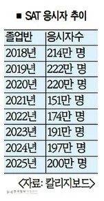 SAT 주관사인 칼리지보드가 최근 발표한 2025년 성적 보고서에 따르면 올해 고교 졸업생 200만4,965명이 SAT에 응시한 것으로 집계됐다. 이는 전년도의 197만3,891명보다 약 1.6% 증가한 수치다. SAT 응시자수가 200만 명을 넘어선 것은 코로나19 사태 발생 이후 처음이다.