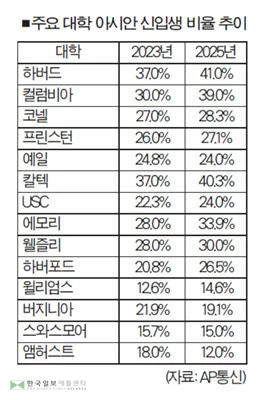 AP통신이 올 가을학기 신입생 인종 통계를 발표한 최상위권 대학 20여곳을 분석한 내용에 따르면 절반이 넘는 11개 대학에서 전년 대비 아시안 비율이 높아진 것으로 나타났다. 특히 하버드대는 올 가을학기 신입생 중 아시안 비율이 41%를 기록해 2년 전의 37%보다 4%포인트 높아졌고, 프린스턴대 역시 신입생 중 아시안 비율이 2023년 26%에서 올해 27.1%로 상승했다.
