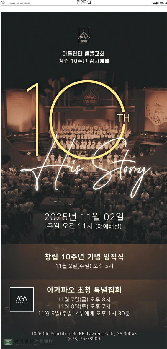아틀란타 벧엘교회는 창립 10주년을 맞아 11월2일 오전11시 감사예배, 오후 5시 임직식, 7일과 8일 아가파오 초청 특별 집회를 개최한다. 문의 = 678-765-8909