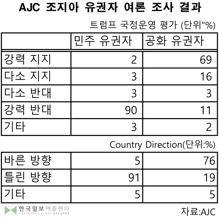 조지아의 정치 지형이 여전히 양극화 상태를 벗어나지 못하고 있는 것으로 조사됐다. 공화당 유권자 다수가 도널드 트럼프 대통령을 강력하게 지지하는 한편 민주당 유권자 절대 다수는 트럼프에 강력 반대하는 것으로 나타났다.