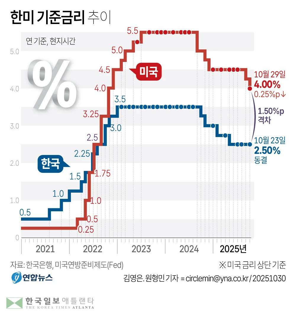 연 4.00∼4.25%→3.75∼4.00%로 0.25%p 내려…한미 금리차 1.50%p로 줄어