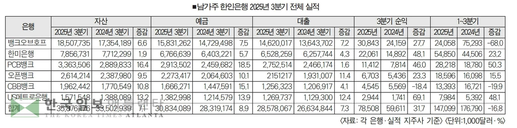 올해 3분기 대출 규모도 증가세를 이어갔다. 뱅크오브호프는 146억2,001만달러로 전년 대비 7.2% 늘었으며, 한미은행은 65억2,825만달러로 4.3% 증가했다.