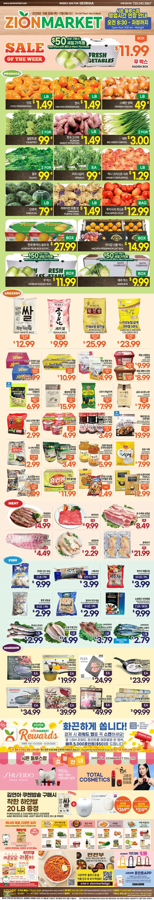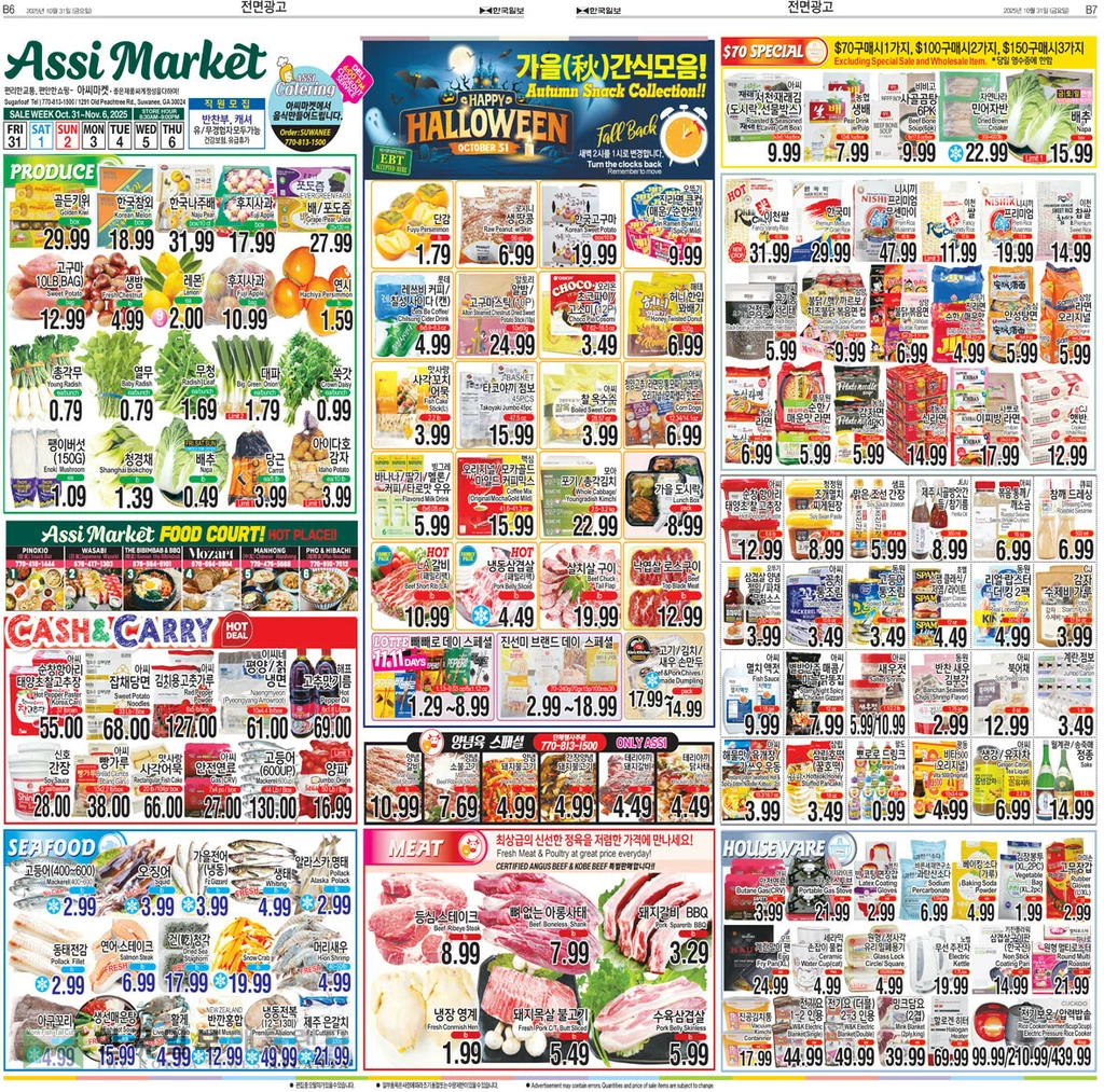 그로서리 코너에서는 한국미 쌀40 LB 29.99, 이천쌀 OLD 40 LB 26.99, 이천 쌀 OLD 15 LB 11.99,이천찹쌀 15 LB 14.99, 아씨 유기농 메주콩/검정콩/서리태/팥30 OZ 5.99, 큐피참깨 드레싱 500ML 6.99, 오뚜기 삼겹살 양념절임소스350 G 3.99, 호멜스팸 라이트12OZ 4.49, 동원 리얼 랍스터 더 킹 2팩2X140G 4.99, CJ감자수제비 가루17.64OZ 3.99, 아씨 굵은 바다 소금 10 LB 6.99에 각각 판매된다.