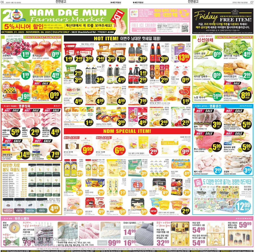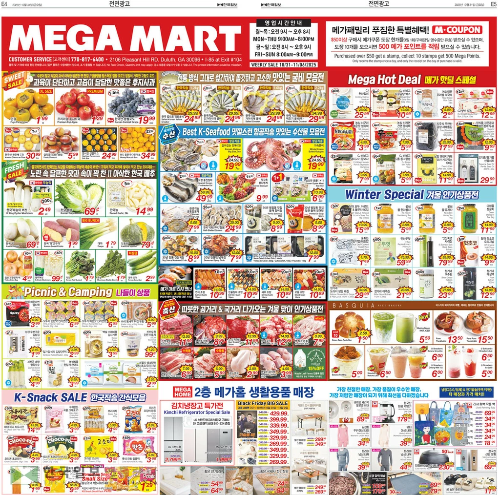 과일 코너에서는 단감 파운드 1.99,프리미엄 후지사과 팩 1.29,한국산 캠벨포도 박스 19.99,한국산 천안배 7과 박스 30.99,캘리포니아산 생밤 파운드 5.99,연시감 선물 박스 $24.99,허니 멀콧 만다린 박스 34.99에 선보인다.