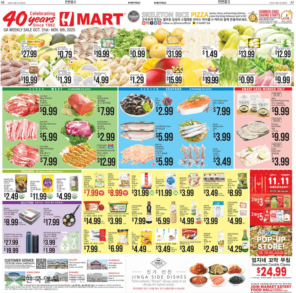 해산물 코너에서는 살아있는 전복 (대) 10ea 19.99,항공 직송 자숙문어 파운드 19.99,항공 직송 고창 풍천장어 2ea 파운드49.99,횟감용 봉지멍게 팩 9.99,생굴 (1+1) 2팩 6.99한국 직송 냉동암꽃게 파운드 7.99,한국 석화(구이/ 찜용) 팩 24.99,30년 범일동 맛집 들깨장어탕/ 얼큰 들깨 장어탕 팩 ea 8.99,30년 전통 간장게장팩 11.99,30년 전통 만든 양념게장 팩 $ 10.99,반건조 구이 3종 (조기/ 갈치/ 가자미) 팩 7.99에 선보인다.
