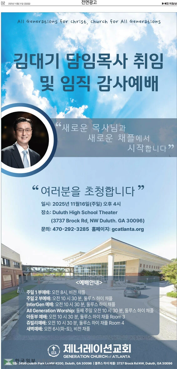 제너레이션교회가 11월16일 주일 오후 4시 김대기 담임목사 취임 및 임직 감사예배를 드린다. 장소 3737 Brock rd., Duluth, GA 30096. 문의=470-292-3285.