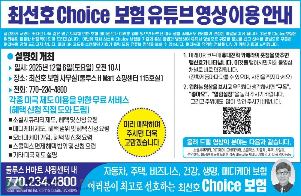 최선호 초이스 보험은 12월 설명회를 12월 6일 토요일 오전 10시 사무실(둘루스 H마트 쇼핑센터 내 115호실)에서 개최한다. 설명회 내용은 소셜시큐리티 제도, 메디케어 제도, 오바마케어 가입, 스쿨택스 면제 등의 내용이다. 전화=770-234-4800.