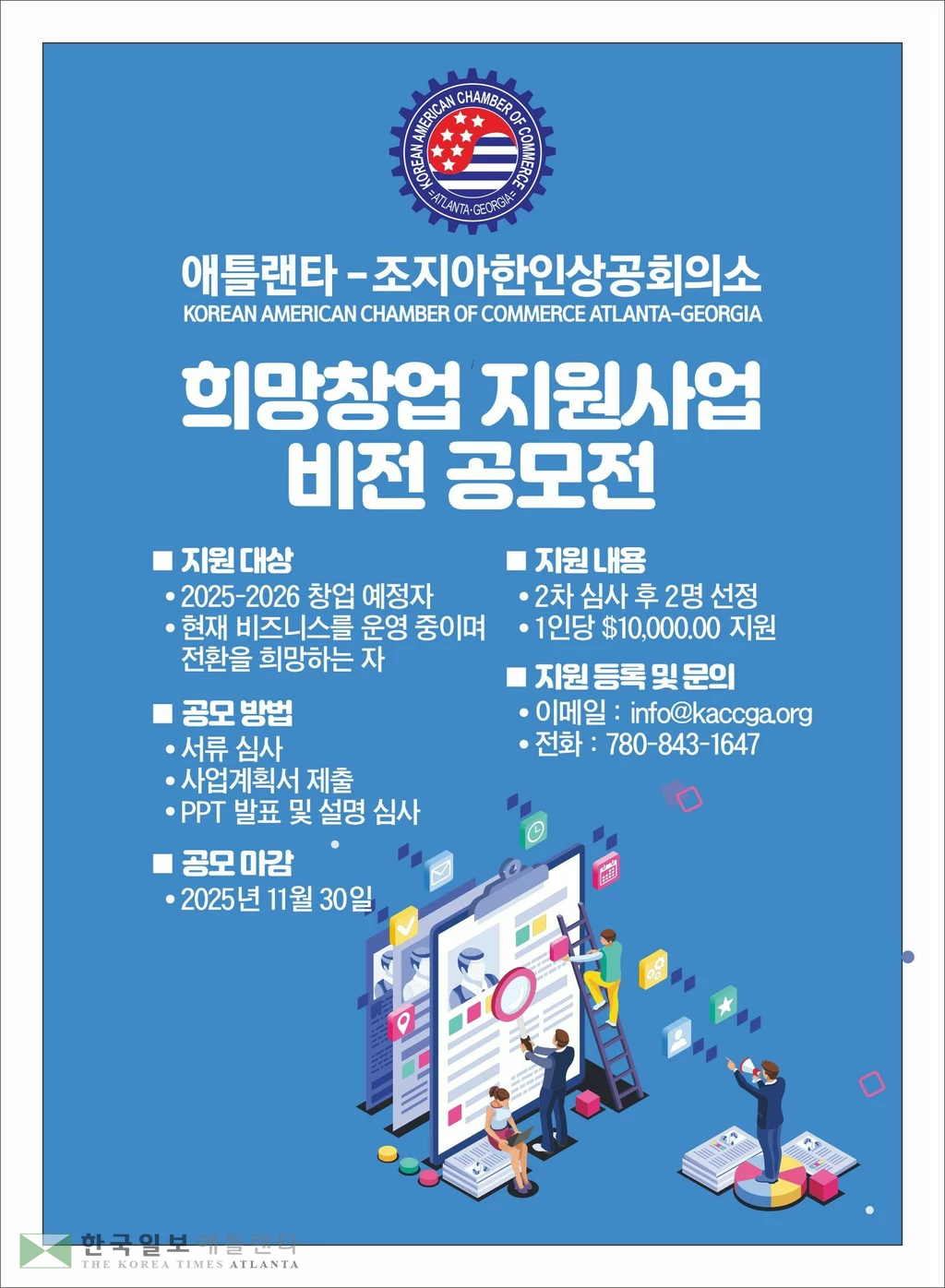 지원자는 서류는 info@kaccga.org에 제출해야 하며, 전화문의는 770-843-1647로 할 수 있다.
