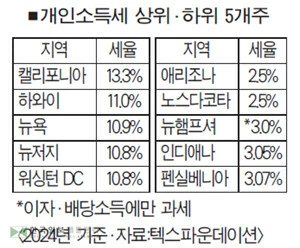 현재 개인소득세를 부과하는 주는 전체 50개 주 가운데 43개 주에 달한다. 이 중 41개 주는 근로소득(임금·급여)에 직접 과세하며, 뉴햄프셔는 배당·이자소득에, 워싱턴주는 자본이익(capital gains)에만 세금을 매긴다. 반면 텍사스, 플로리다, 네바다, 와이오밍, 알래스카 등 7개 주는 개인소득세 자체가 없다. 가주의 14.4% 최고 세율은 소득세가 없는 주와 비교할 때 극명한 대조를 이루며, 2.5% 수준인 애리조나나 노스다코타의 6배가 넘는 수준이다. 미국 내 다수의 주가 단일세율을 채택해 모든 소득 구간에 동일한 세율을 적용하는 추세와 달리 가주는 급격한 누진세 구조를 채택하고 있어 ‘누진세의 끝판왕’으로 불린다.