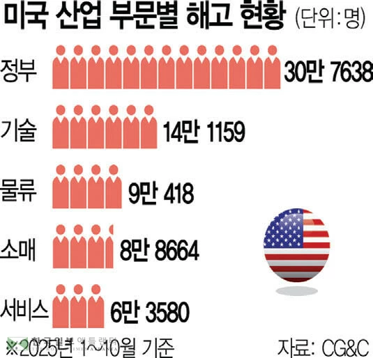 미국 기업들의 감원 바람은 AI 도입에 직격탄을 맞은 기술 부문에서 두드러졌다. 기업들은 지난달 기술 부문에서만 3만3,281명의 감원을 발표해 9월의 5,639명보다 크게 증가했다. 기술기업이 올 1~10월 공표한 감원 인력 14만1,159명도 지난해 같은 기간의 12만470명보다 17% 늘었다.