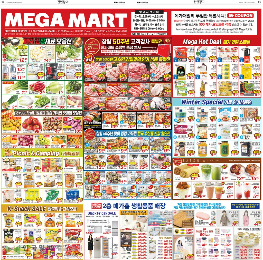창립 50 주년 고객감사 특별전으로 100달러 이상 구매 고객에 메가마트 쇼핑백 무료증정 행사가 11/4(금)~11/16(일) 3일간 진행된다. (1일 100 개 한정 수량 증정)