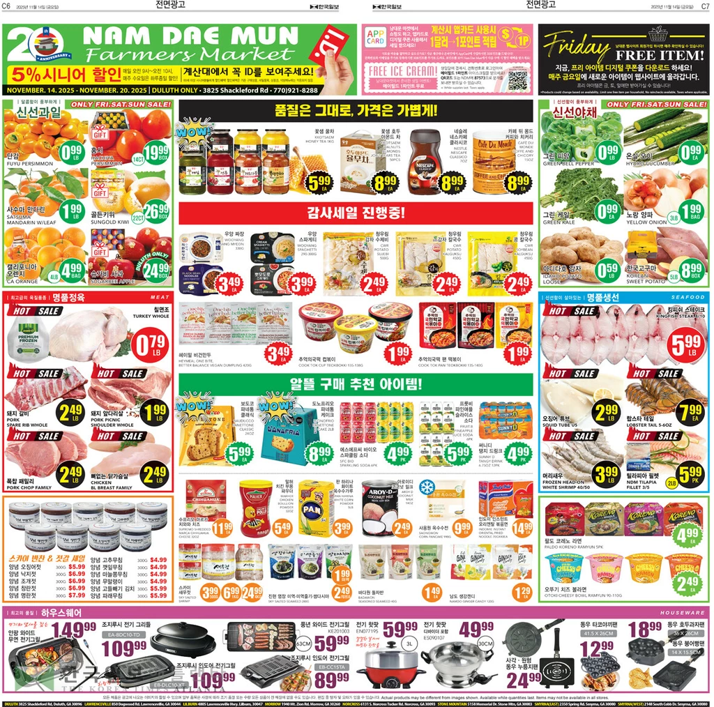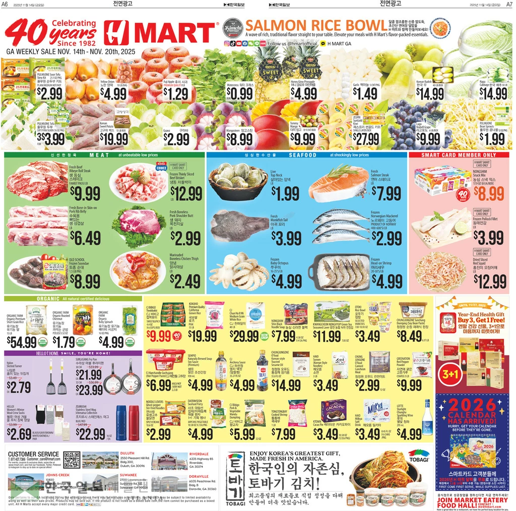 그로서리 코너에서는 천하일미 40LB EA 29.99, 국보 쌀 로즈(핑크) 15LB EA 19.99, 농심 신라면 블랙 멀티 4.58OZ(130G) EA 7.99, 해오름 소면 3LB EA 3.49, CJ 해찬들 순한맛 고추장 35.27OZ(1KG) EA 6.99, 청정원 순창 재래식된장 6.17LB(2.8KG) EA 8.49, 샘표 맑은조선간장 930ML EA 4.99, 청정원 오푸드 통참깨참기름 55.8 FL OZ(1.65L)EA 14.99, CJ 하선정 멸치액젓 알뜰형 35.27FLOZ(1KG) EA 4.99, 광천 농협 녹차 전장김 선물세트 7.04OZ(20G) EA 11.99,청정원 런천미트 12OZ EA 2.99,오뚜기 매콤낙지덮밥 9.88 OZ (280G) EA 3.49에 각각 할인판매된다.