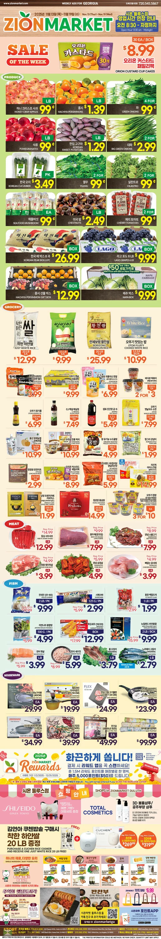 프로듀스 코너에서는 단감 LB 0.99, 홍시박스14CT/BOX 19.99, 잎달린 사수마 만다린LB 1.99, 골든 키위22CT/BOX 26.99, 슈가비 사과 박스BOX 24.99, 캘리포니아 오렌지백 4LB/BAG 4.99, 한국고구마 5LB/BOX 8.99, 케일 EA 0.99, 그린피망LB 0.99, 아이다호 감자LB 0.59, 노랑양파백EA 1.99, 온실오이EA 0.99에 판매된다.