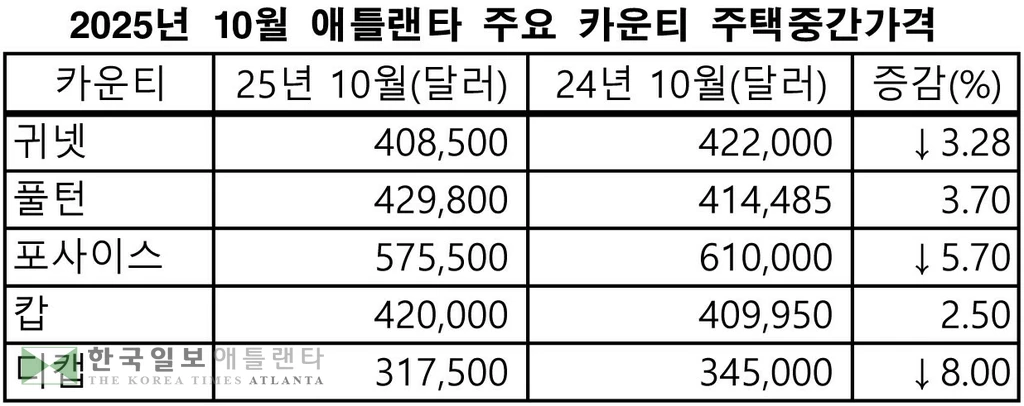 한인 다수 거주지역인 귀넷의 주택중간가격은 40만8,500달러로 지난해 같은 기간 42만2,000달러와 비교해 3.2%가 내렸다.